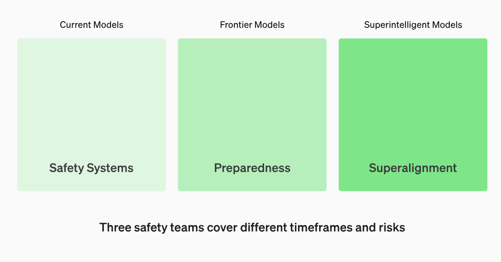 “We have several safety and policy teams working together to mitigate risks from AI. Our Safety Systems team focuses on mitigating misuse of current models and products like ChatGPT. Superalignment builds foundations for the safety of superintelligent models that we (hope) to have in a more distant future. The Preparedness team maps out the emerging risks of frontier models, and it connects to Safety Systems, Superalignment and our other safety and policy teams across OpenAI.”