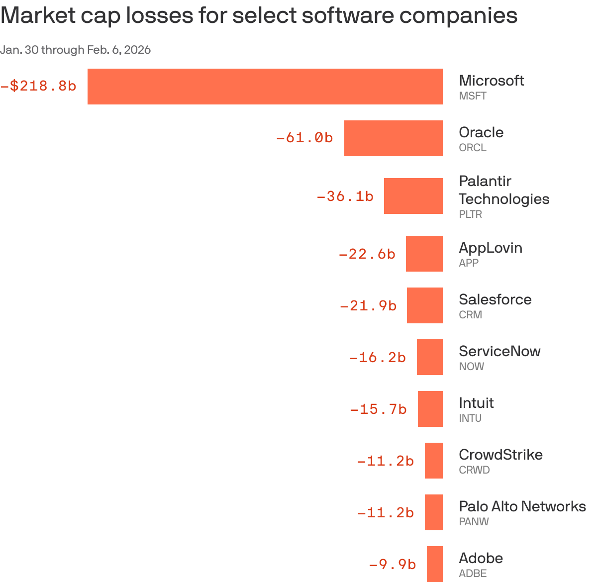 “Why it matters: The software selloff dragged down the entire market on Tuesday—it’s the first example of how the market will respond when presented with evidence that AI could disrupt or even replace an entire industry.”